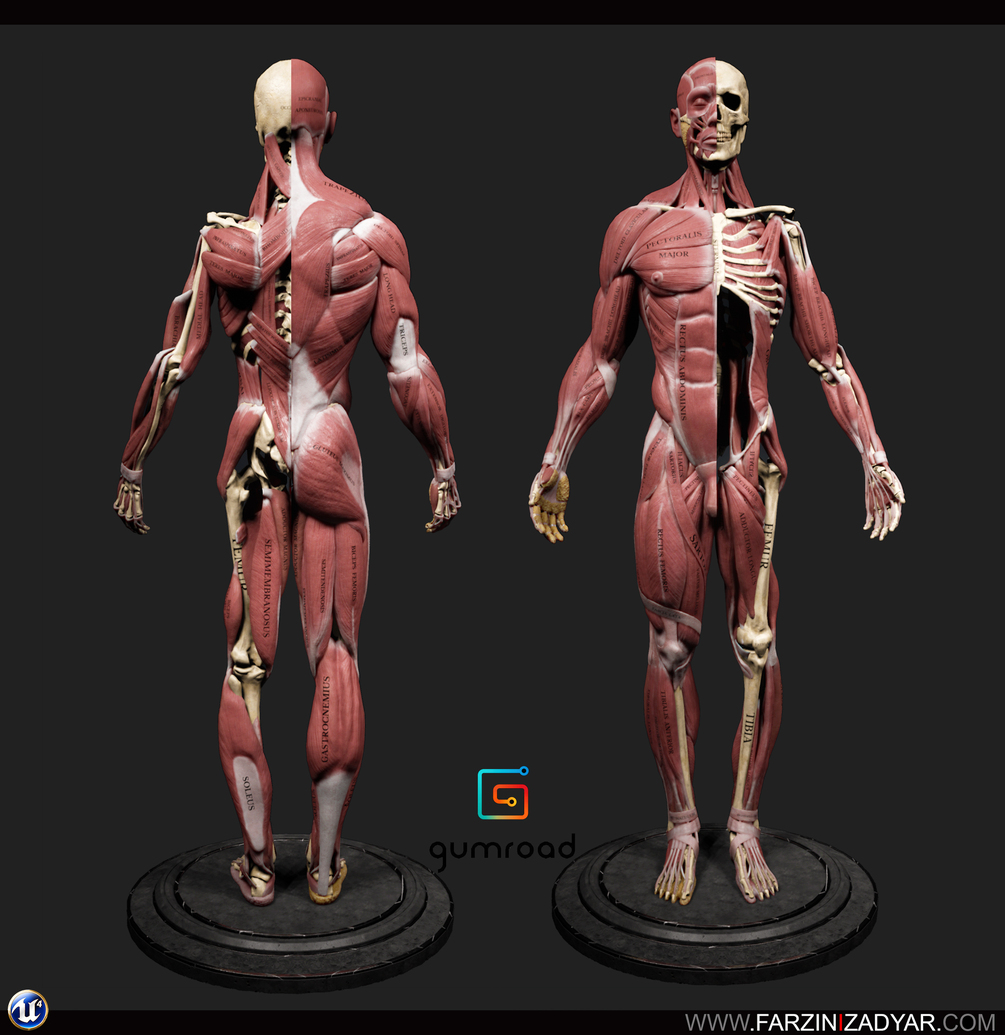3D Digital human anatomy model is a great learning companion with all the muscles and bones named. There is also Colour-code included in this package as well as muscle striation.