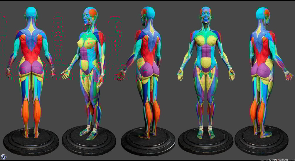 3D Female anatomy model is a great learning companion with all the muscles and bones named. There is also Colour-code included in this package as well as muscles striation.