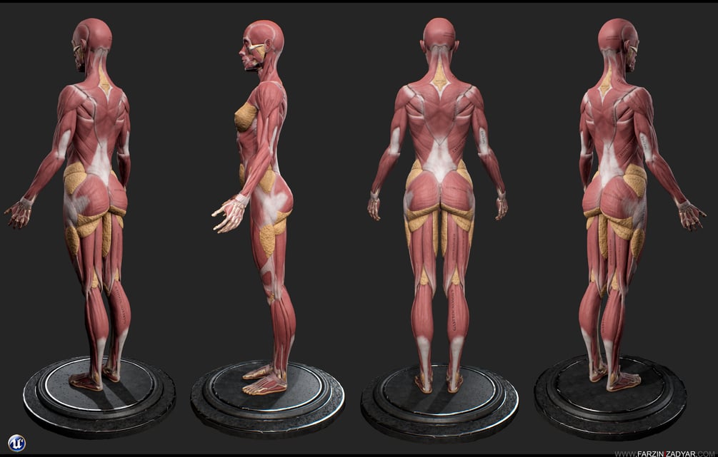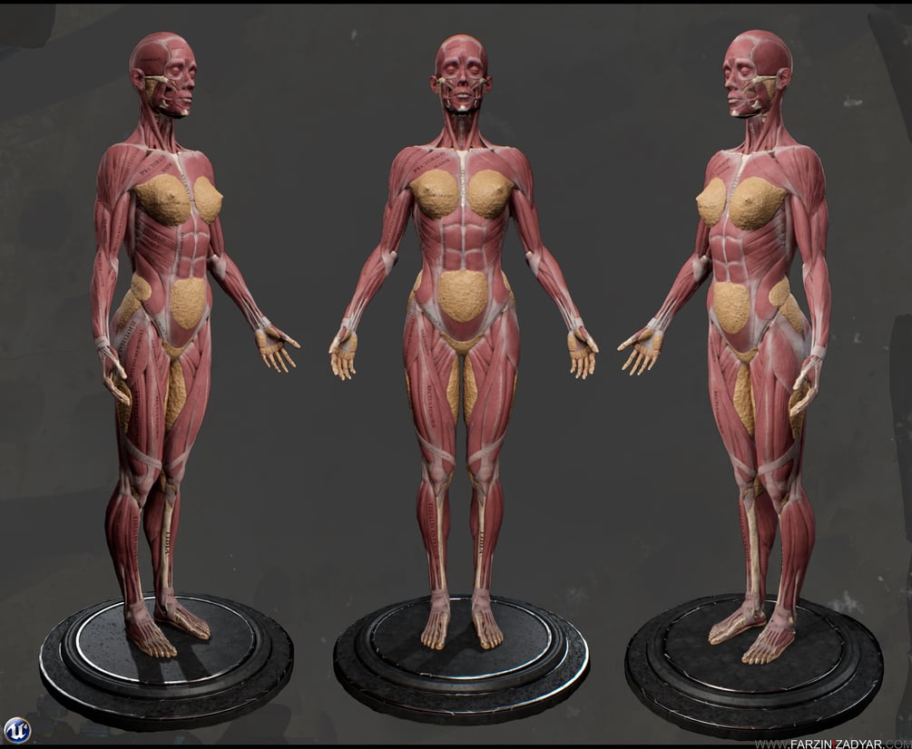 3D Female anatomy model is a great learning companion with all the muscles and bones named. There is also Colour-code included in this package as well as muscles striation.